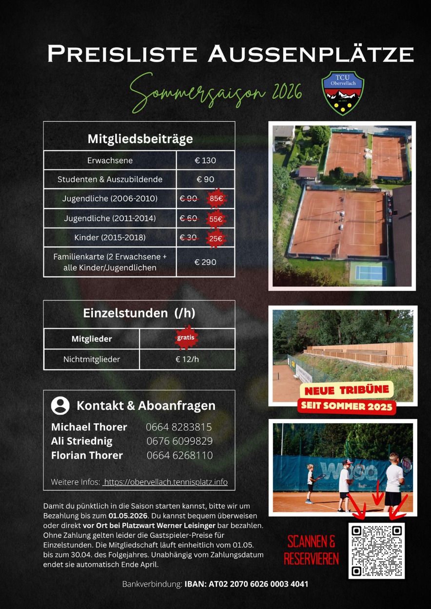 Bitte beachtet außerdem: Den Anweisungen unseres Platzwartes Werner Leisinger ist bei der Nutzung der Freiplätze unbedingt Folge zu leisten. Und ganz wichtig: Die Kabinen dürfen auch heuer nicht mit Sandplatzschuhen betreten werden.